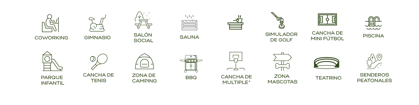 Vive la experiencia única de Bosque Nativo, un proyecto que integra naturaleza y comodidad en un mismo espacio. Disfruta de amplias zonas verdes y senderos peatonales ideales para caminatas y conexión con el entorno. Practica deportes en la cancha múltiple o mejora tu swing en la exclusiva jaula de golf. Relájate en la piscina, comparte con amigos en la zona BBQ o diviértete con los más pequeños en el salón de juegos. Tu mascota también tendrá su lugar especial en la zona pet-friendly. Todo diseñado para ofrecerte un estilo de vida activo, familiar y en armonía con la naturaleza.
